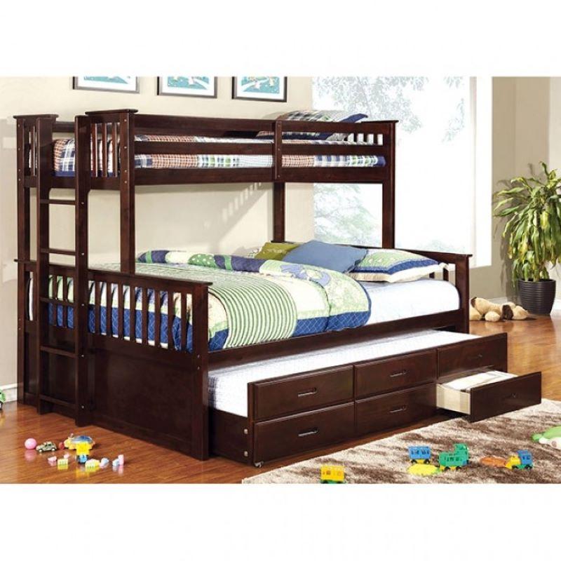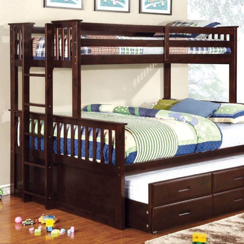 This sturdy bunk bed features side ladder for easy access to top twin XL, lower queen bed with twin XL trundle and roomy drawers underneath.