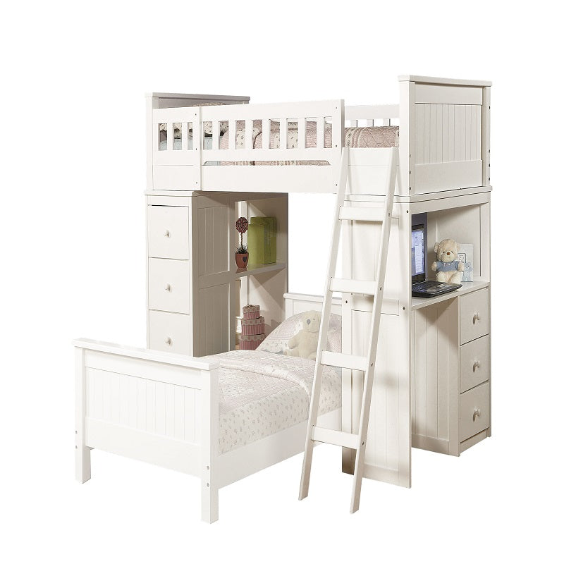 Experience the timeless charm of the Willoughby Loft Twin Bed—a classic addition to any bedroom. This collection features classical details, wide beadboard panels, round knobs, and is carefully crafted from selected wood and veneers. The top twin-size bed sits gracefully above a desk, cabinet drawers, and storage shelves, offering a multifunctional solution for sleeping, storage, study, and more.